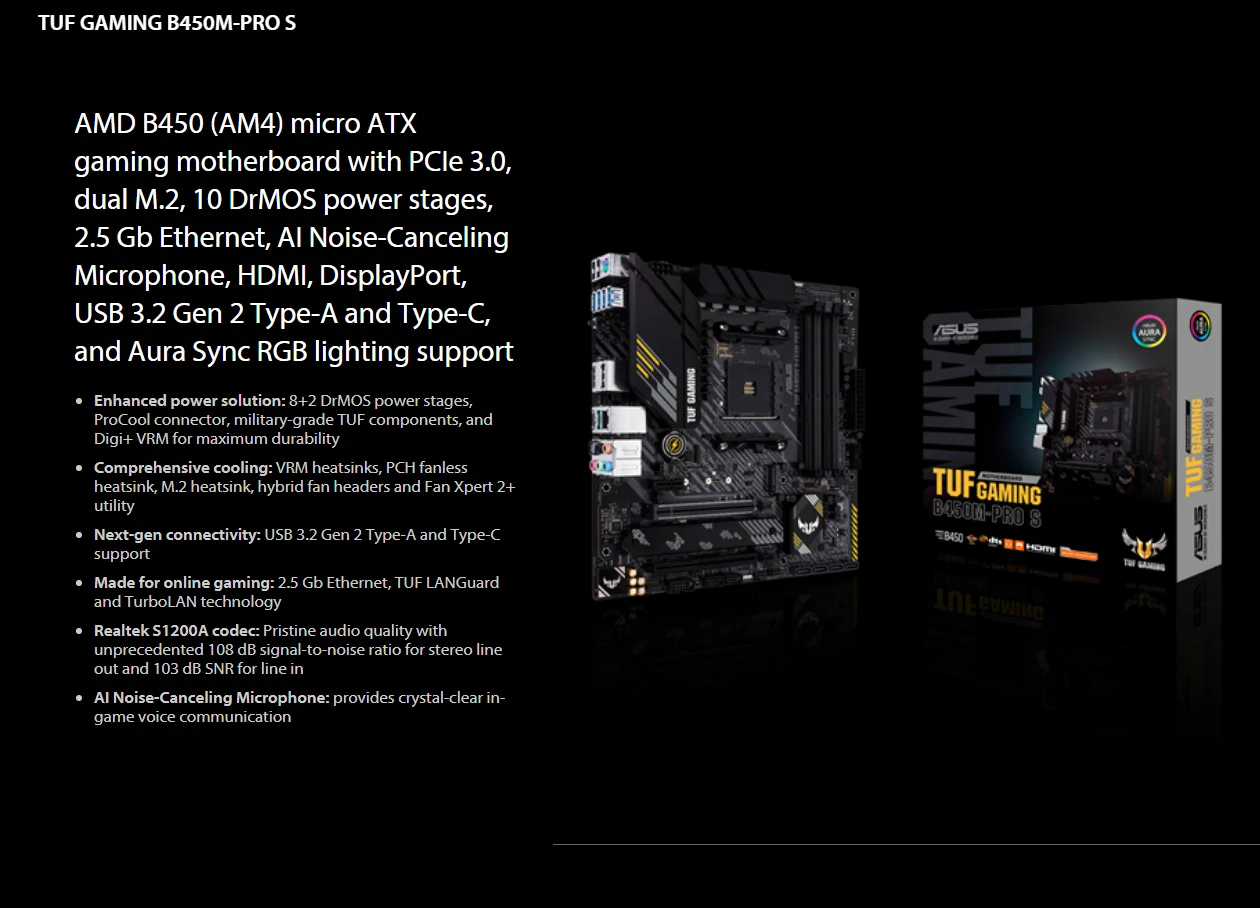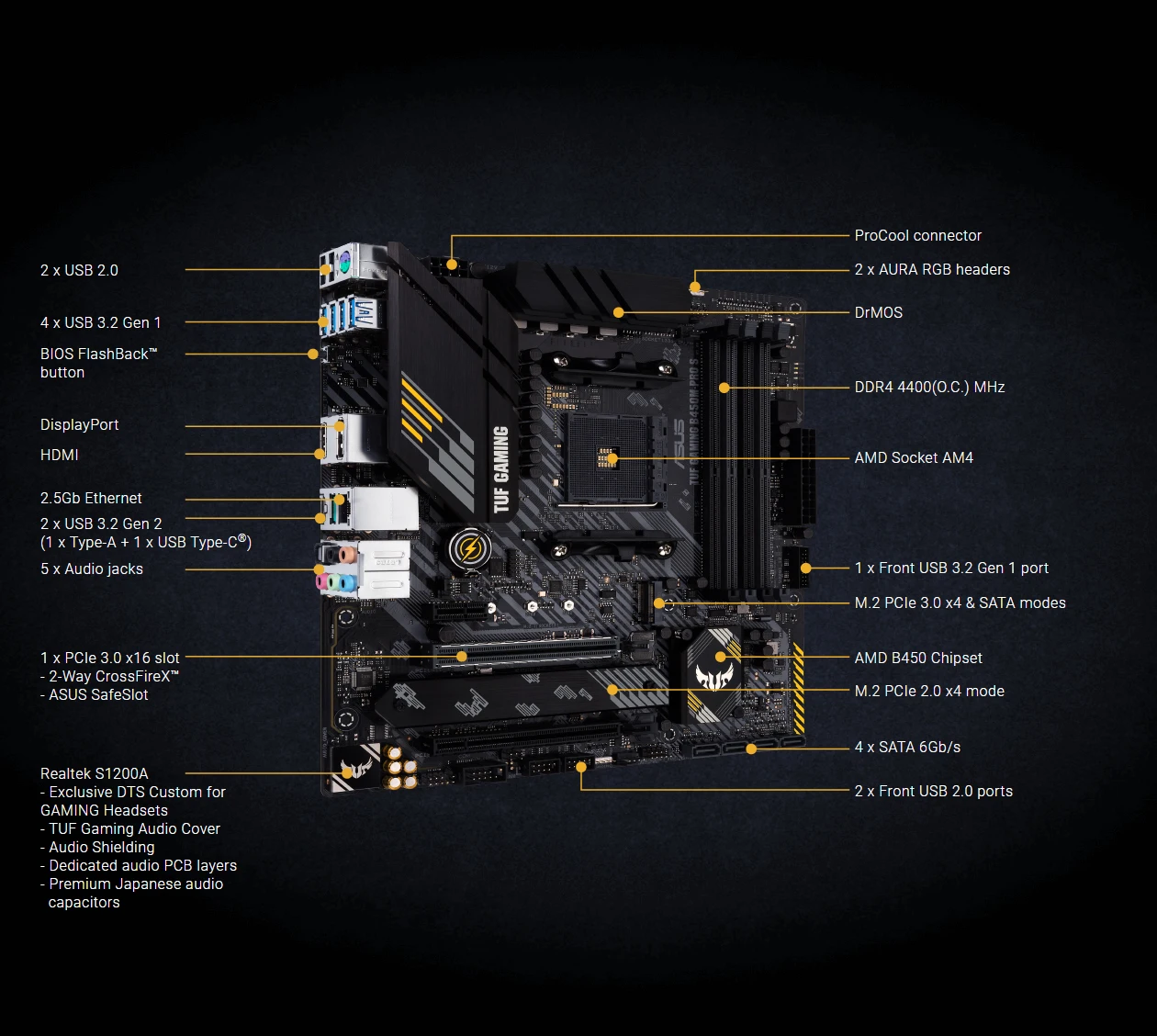 - > ASUS TUF GAMING B450M PRO S B450M AMD B450 DDR4 4400MHz 128G,M.2, HDMI 2.0B, tipo C e CPU nativa USB 3.1 Gen 2 Desktop AM4